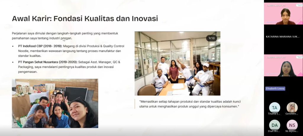 Acara dimulai dengan doa, lalu dilanjutkan perkenalan jenjang karir Kak Lexna dimulai dari tahun 2018-2019 yaitu magang di PT Indofood CBP Sukses Makmur TBK, dari sinilah Kak Lexna memiliki cita-cita menjadi QC dan memiliki mindset akan mengejar karir hingga bisa bekerja menjadi seorang QC di suatu perusahaan. Selama bekerja di PT Pangan Sehat Nusantara, Kak Lexna mendapatkan banyak ilmu, inspirasi, serta inovasi tentang penanaman sayuran. Karir Kak Lexna tentunya tak berhenti sampai disini, setelah penelitian selesai, Kak Lexna kembali memanfaatkan waktu luangnya untuk bekerja sebagai perancang bisnis di Susteran Syantikara Youth Center yang bertanggungjawab untuk merencanakan serta mengembangkan inovasi produk.