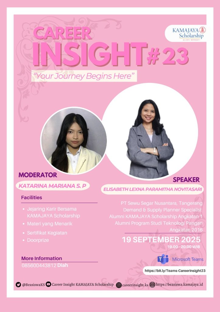 Dalam acara Career Insight #22 yang diselenggarakan oleh KAMAJAYA Scholarship pada Jumat, 19 September 2025, Kak Elisabeth Lexna Paramitha Novitasari, alumni penerima Beasiswa KAMAJAYA Scholarship Angkatan 1, berbagi pengalaman berharga mengenai perjalanan kariernya di dunia dari masa-masa perkuliahan hingga saat ini bekerja di perusahaan ternama. Kak Lexna merupakan lulusan S1 Tekonologi Pangan Universitas Atma Jaya Yogyakarta (2016). Saat ini, ia berkarier sebagai Demand & Supply Planner Specialist – Fresh Fruit | PT Sewu Segar Nusantara, Tangerang (Juni 2025- Present).