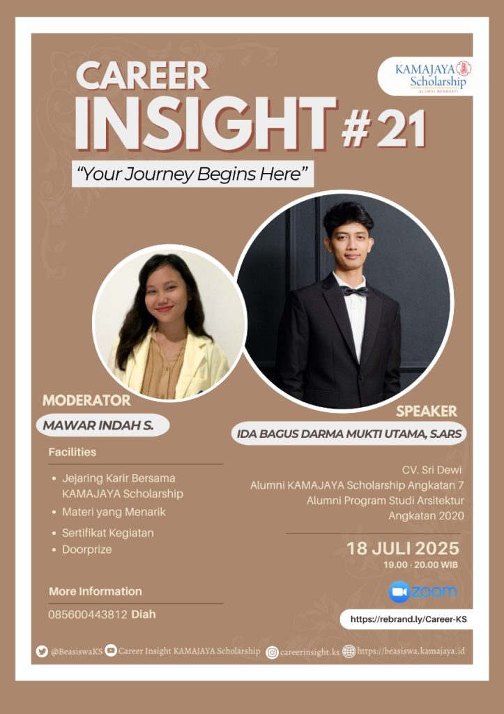 KAMAJAYA Scholarship kembali menghadirkan Career Insight #21 dengan tema “Your Journey Begins Here” pada Jumat, 18 Juli 2025, pukul 19.00-20.00 WIB melalui platform Zoom. Acara yang dipandu oleh Mawar Indah S. ini menghadirkan narasumber inspiratif, Ida Bagus Darma Mukti Utama (Kak Darma), alumni KAMAJAYA Scholarship Angkatan 7 dari Program Studi Arsitektur yang kini berkarier di CV. Sri Dewi.