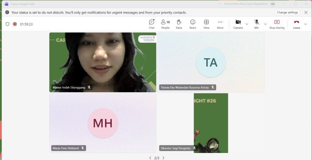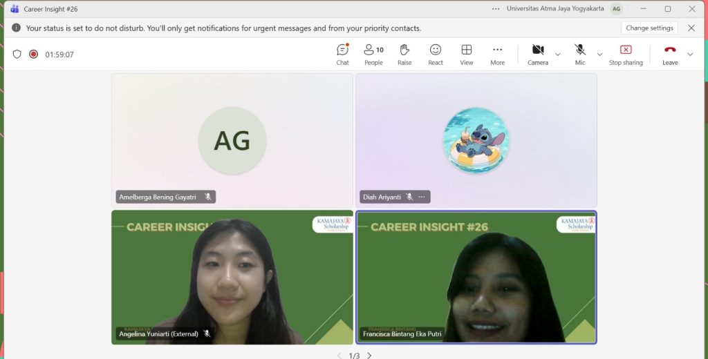 KAMAJAYA Scholarship kembali menyelenggarakan program Career Insight #14 pada Jumat, 23 Januari 2026, sebagai wadah berbagi pengalaman dan wawasan karier bagi para awardee dan mahasiswa. Kegiatan ini menghadirkan Kak Angelina Yuniarti atau yang akrab disapa Kak Angel, Penerima Beasiswa KAMAJAYA Scholarship Angkatan 5, yang saat ini berkarier sebagai Procurement Staff PT Lion Wings (Wings Group) serta merupakan Alumni Program Studi Biologi UAJY angkatan 2020.