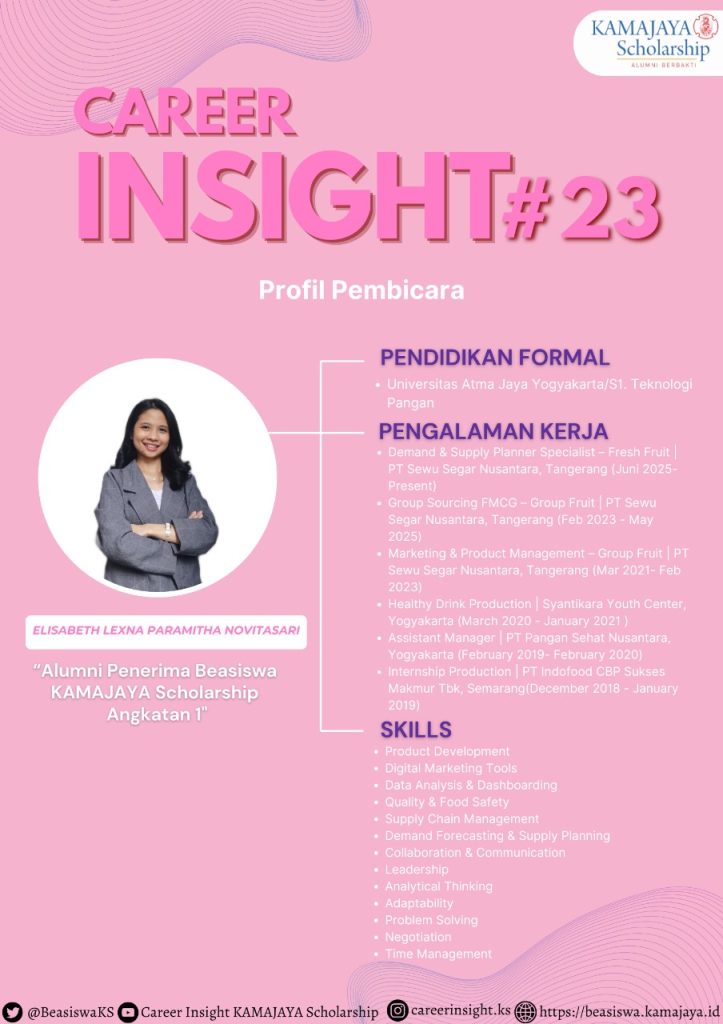 Di seri ke-23 yang diselenggarakan pada Jumat, 19 September 2025, Career Insight #23 menghadirkan narasumber Kak Elisabeth Lexna Paramitha Novitasari. Kak Lexna adalah Penerima Beasiswa KAMAJAYA Angkatan ke-1, alumni Program Studi Tekonologi Pangan UAJY Angkatan 2016 bersama dengan moderator Katarina Mariana Sukma P, yang merupakan Penerima Beasiswa KAMAJAYA Angkatan ke-9