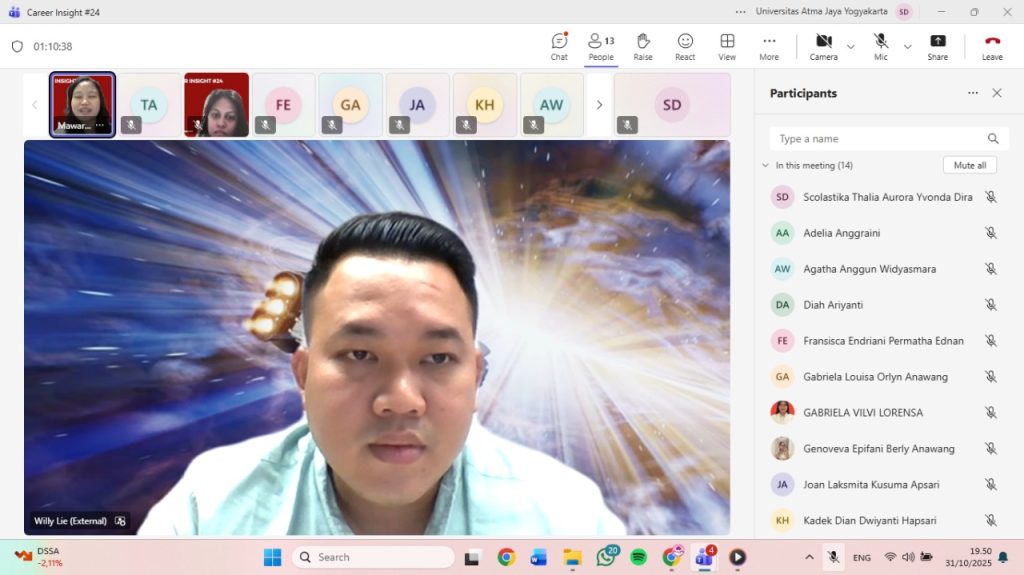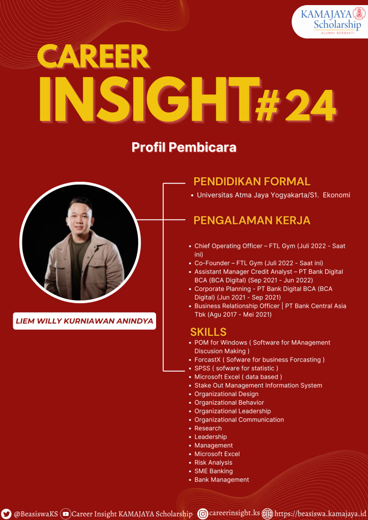 Di seri ke-24 yang diselenggarakan pada Jumat, 31 Oktober 2025, Career Insight #24 menghadirkan narasumber Kak Liem Willy Kurniawan Anindya. Kak Liem alumni Program Studi Manajemen UAJY Angkatan 2017 bersama dengan moderator Mawar Indah Sitanggang, yang merupakan Penerima Beasiswa KAMAJAYA Angkatan ke-9