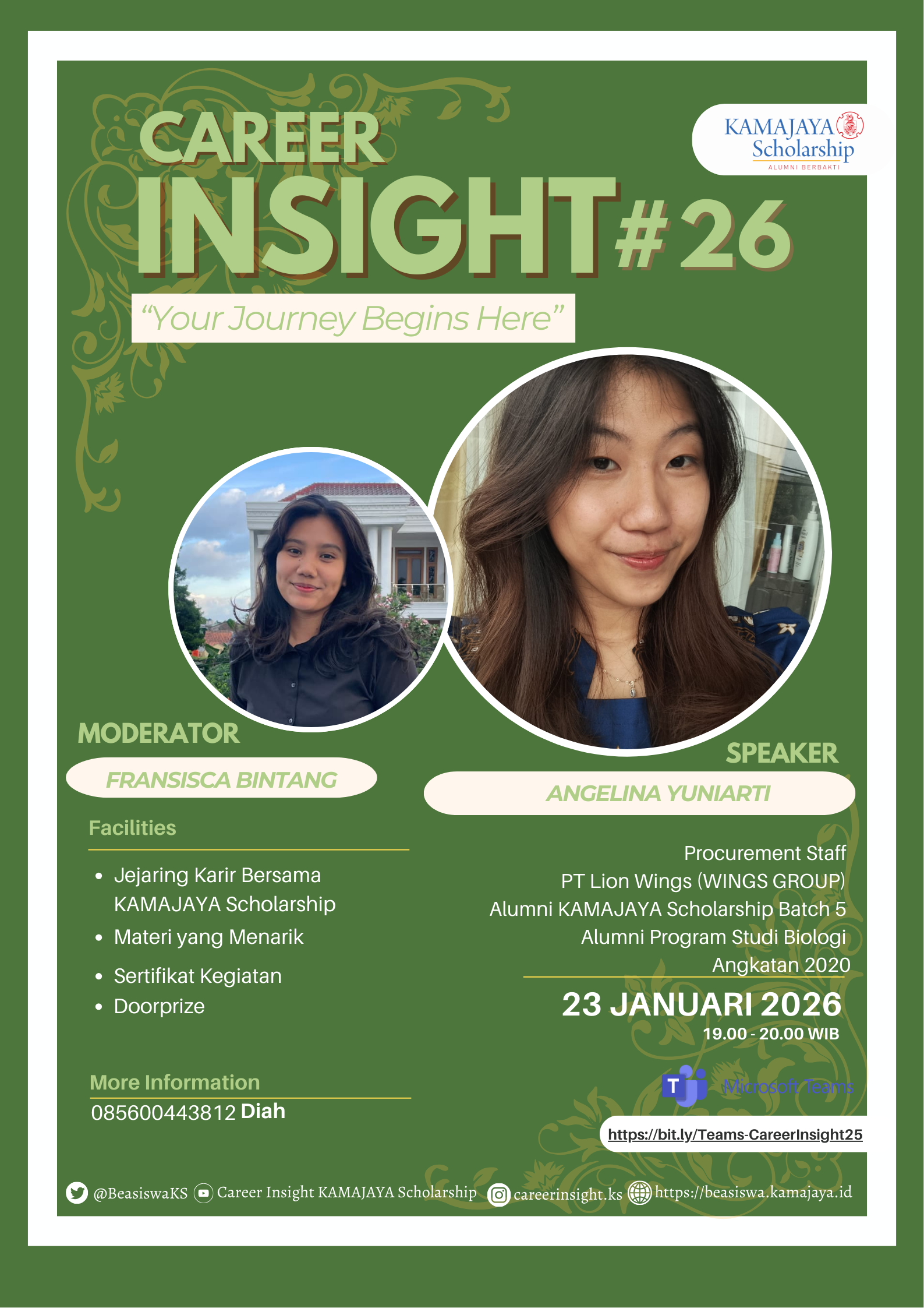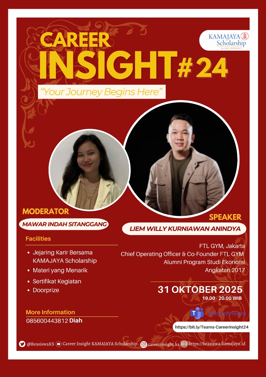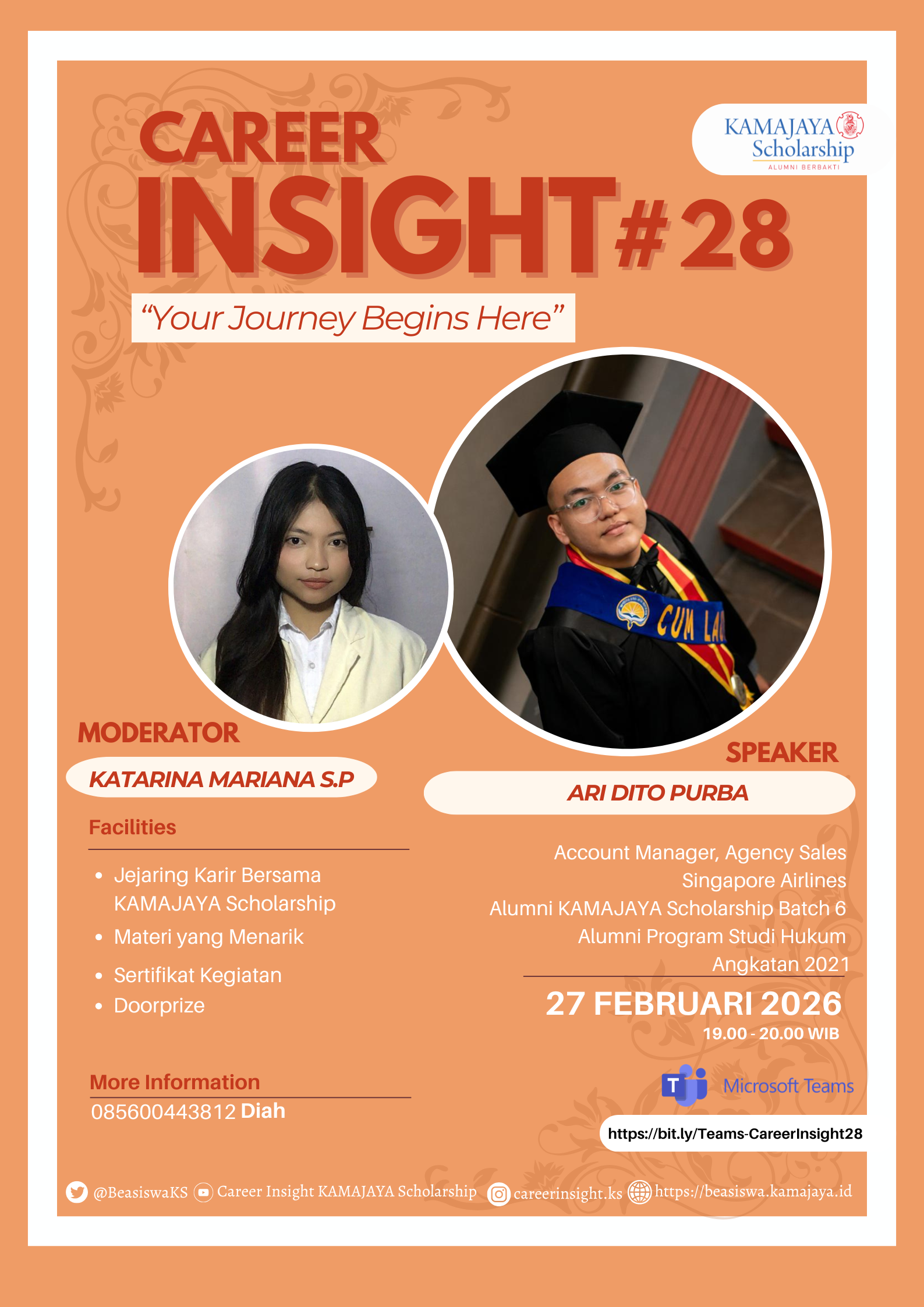“Career Insight” adalah program berbagi pengalaman dalam bentuk ngobrol sersan (serius tapi santai) dari para alumni KAMAJAYA Scholarship untuk adik-adik Penerima Beasiswa KAMAJAYA mengenai knowledge, soft skills, experience, networking, dan perjalanan karir di dunia kerja.