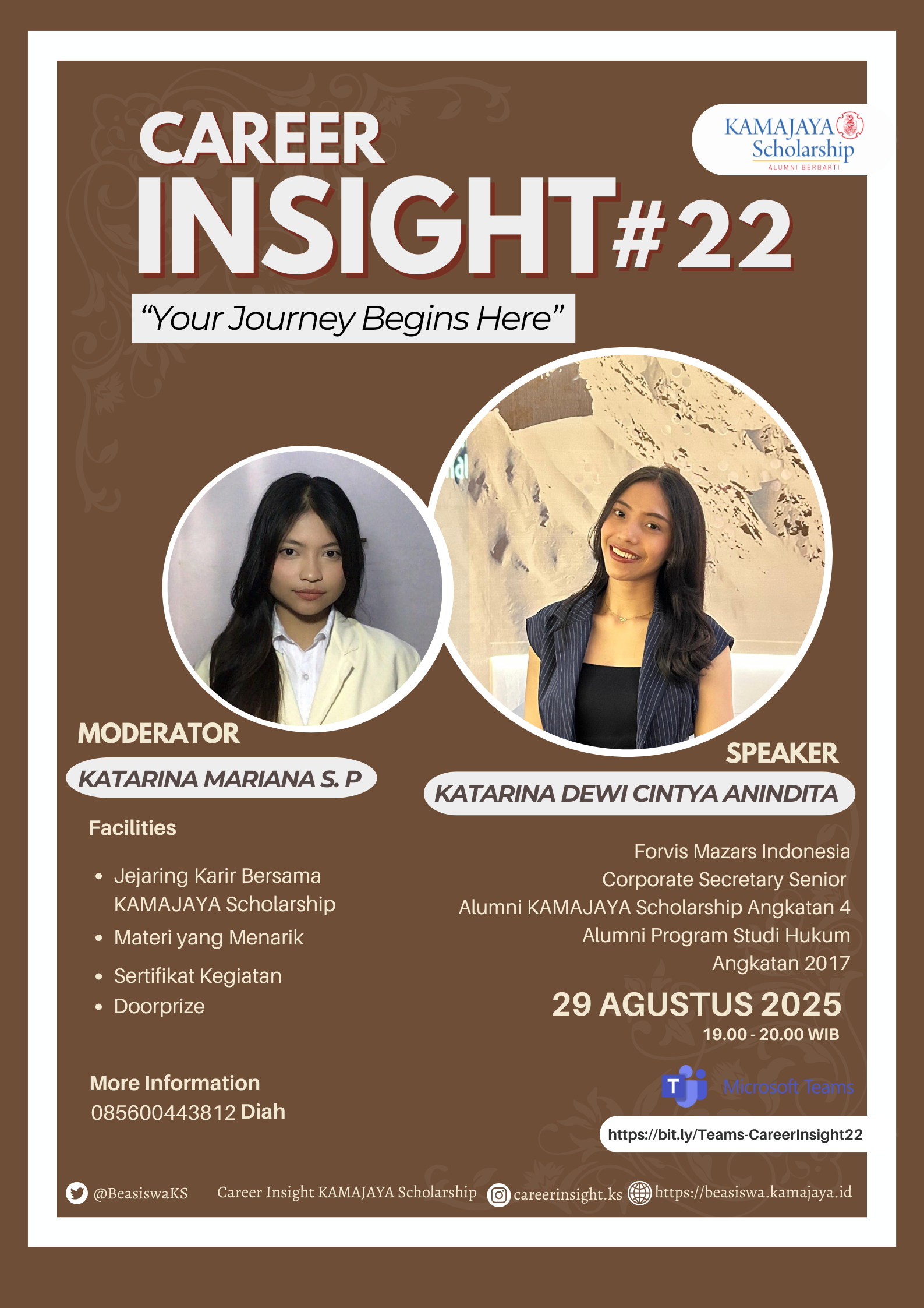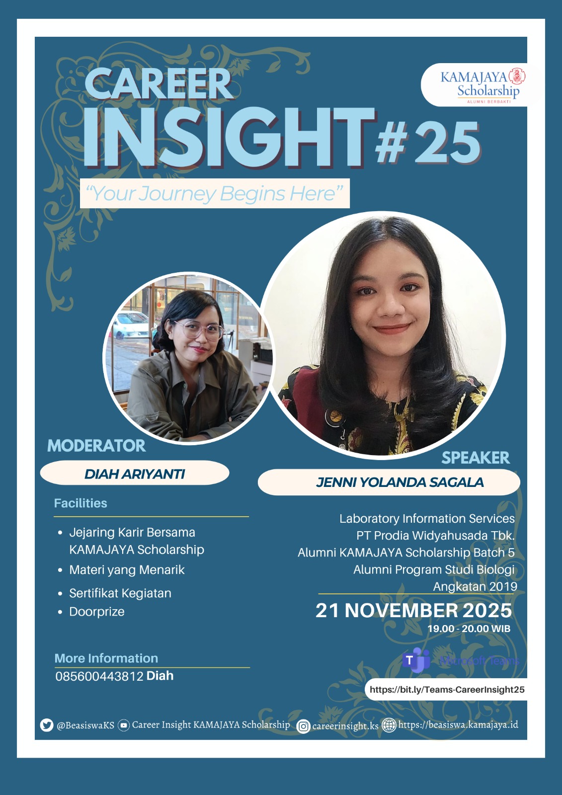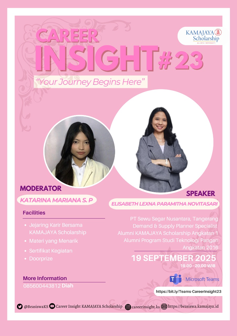 “Career Insight” adalah program berbagi pengalaman dalam bentuk ngobrol sersan (serius tapi santai) dari para alumni KAMAJAYA Scholarship untuk adik-adik Penerima Beasiswa KAMAJAYA mengenai knowledge, soft skills, experience, networking, dan perjalanan karir di dunia kerja.